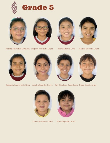Grade 5 Kenssy Sthefania Espinoza Majorie Valentina López Ximena María Leiva María Saraelena Lopez Samanta Anayte de la Rosa Amalia Izabella Cotero Iker Gianluca Castellanos Diego Andrés Arias Carlos Francisco Cabo Juan Alejandro Abad